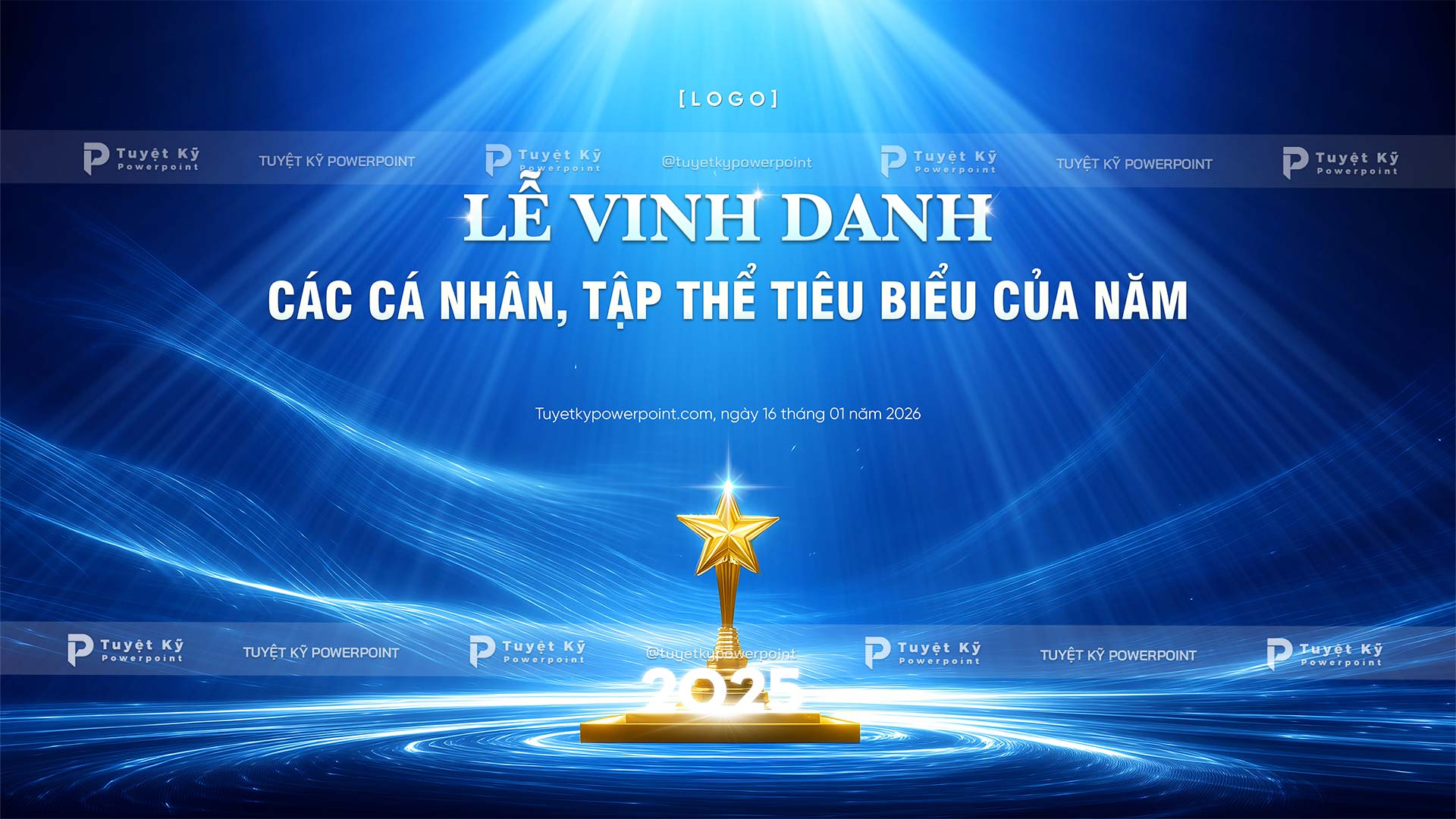 Tông xanh – vàng sang trọng, phù hợp các chương trình lễ vinh danh.