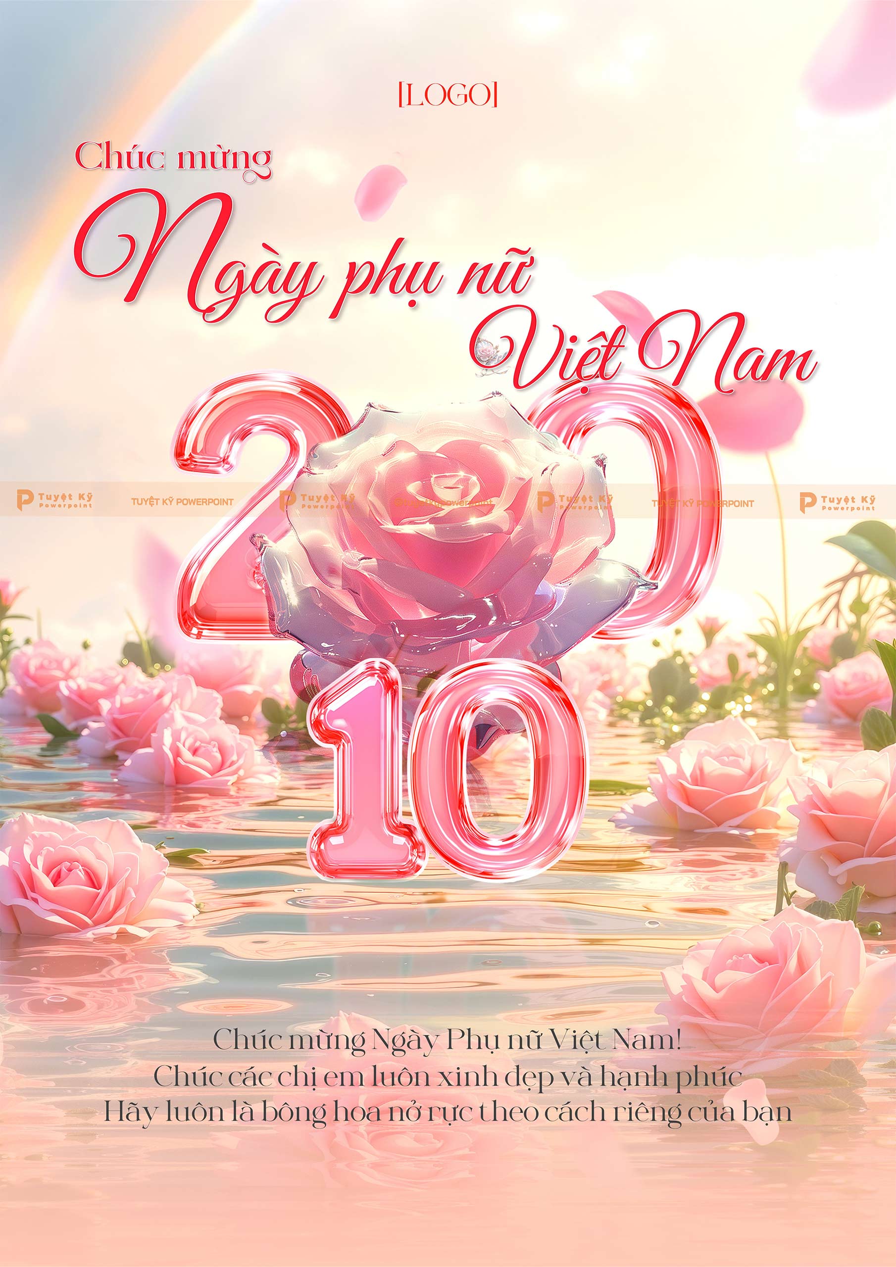 Mẫu poster chúc mừng Ngày Phụ nữ Việt Nam 20/10 được thiết kế nhẹ nhàng, tinh tế với hình ảnh hoa hồng bay bổng trên nền nước phản chiếu lung linh. Tông màu hồng pastel chủ đạo mang đến cảm giác ấm áp, yêu thương và trân trọng phái đẹp. Đây là mẫu thiết kế phù hợp để lan tỏa thông điệp tôn vinh, chúc mừng phụ nữ Việt Nam trong ngày đặc biệt. Dễ dàng tùy chỉnh logo, lời chúc và nội dung theo nhu cầu.