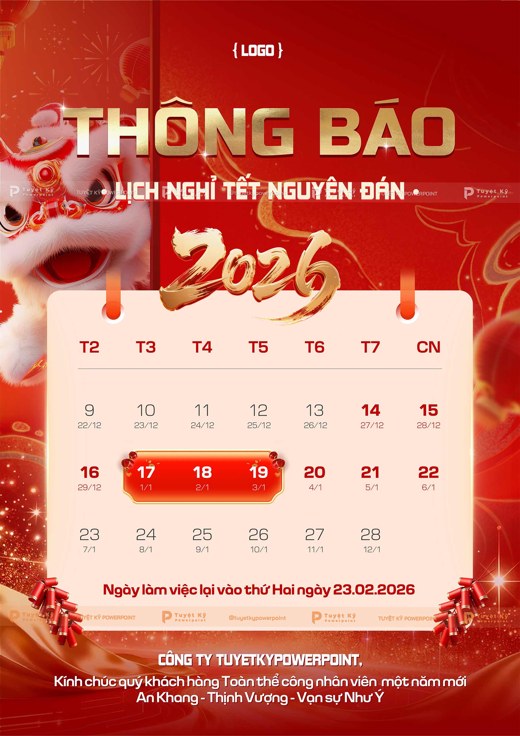 Bố cục dạng lịch trực quan giúp người xem dễ dàng nắm bắt thời gian nghỉ Tết và ngày làm việc trở lại. Hình ảnh múa lân, pháo Tết và typography nổi bật tạo không khí xuân rộn ràng, trang trọng. Mẫu poster phù hợp cho doanh nghiệp, tổ chức sử dụng trên mạng xã hội hoặc in ấn treo văn phòng dịp Tết.