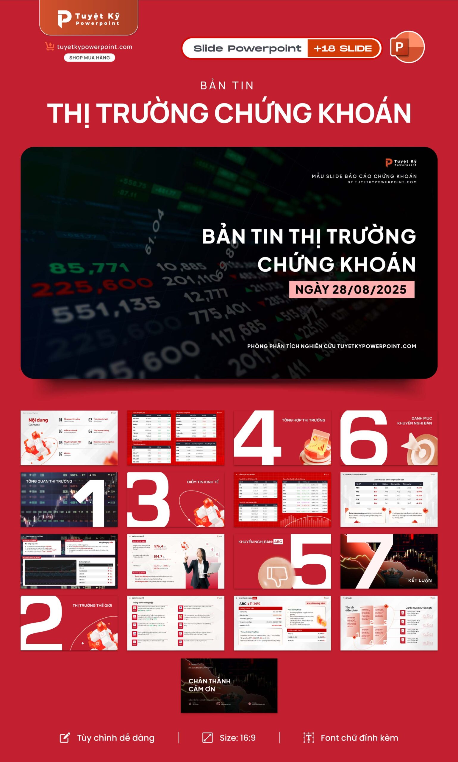 Với Mẫu Slide Bản tin Thị trường Chứng khoán [Ver đỏ], bạn dễ dàng trình bày báo cáo chuyên nghiệp, trực quan và nhấn mạnh yếu tố cảnh báo rủi ro. Đây là công cụ đắc lực giúp doanh nghiệp, nhà đầu tư và giảng viên tài chính đưa ra chiến lược phòng thủ hiệu quả, hạn chế rủi ro và bảo toàn vốn đầu tư.
