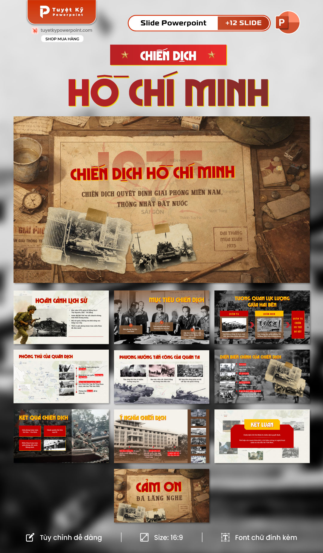 Mẫu Slide Chiến Dịch Hồ Chí Minh được thiết kế với phong cách lịch sử – tư liệu, nhấn mạnh không khí chiến tranh cách mạng. Slide sử dụng bố cục khoa học, hình ảnh tư liệu minh họa rõ nét, bản đồ, biểu đồ so sánh lực lượng và mốc thời gian trực quan.