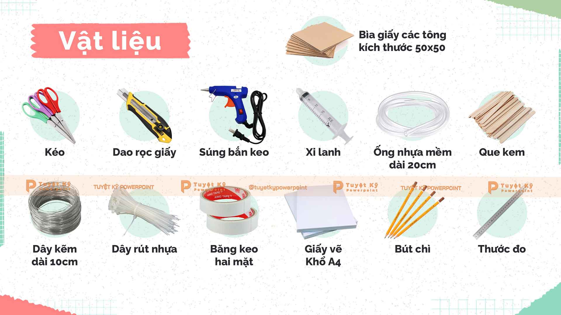 Vật liệu: Cung cấp danh sách các vật liệu và công cụ cần thiết như keo, xi lanh, ống nhựa mềm, bia carton và các dụng cụ cơ bản khác để lắp ráp mô hình một cách hiệu quả.