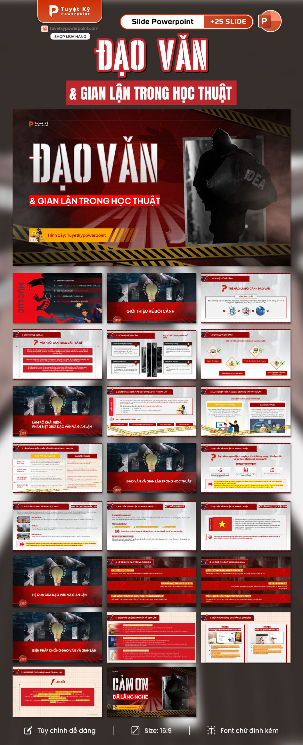 Mẫu slide được thiết kế theo phong cách hiện đại, tông màu đỏ – đen cảnh báo, hình ảnh minh họa mạnh mẽ, dễ thu hút sự chú ý. Bố cục slide rõ ràng. Các slide sử dụng biểu tượng trực quan, sơ đồ phân nhánh, bảng so sánh và highlight nội dung quan trọng.