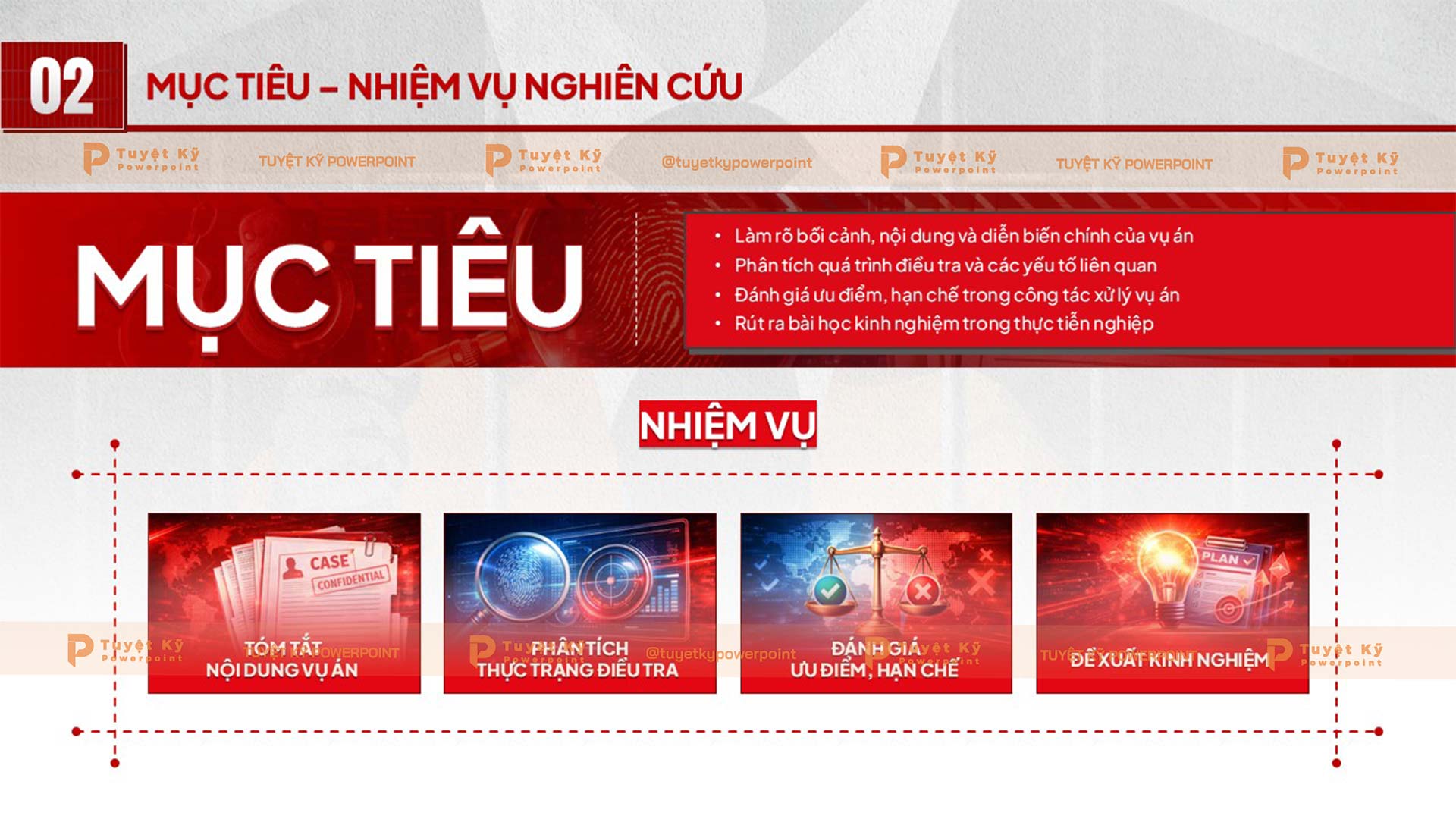 Tông màu đỏ – đen nhấn mạnh tính chất nghiêm trọng của vụ án. Thiết kế giúp nâng cao hiệu quả truyền đạt và tạo ấn tượng chuyên môn cao. Đây là lựa chọn phù hợp cho các bài trình bày mang tính phân tích, đánh giá và đề xuất giải pháp trong lĩnh vực pháp luật.
