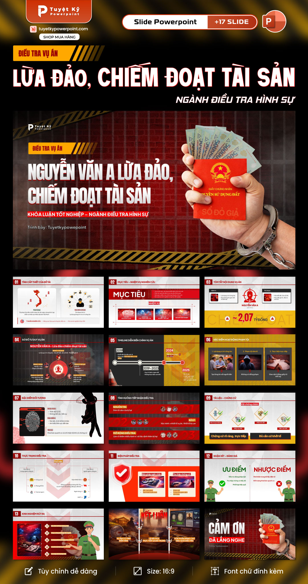 Slide phù hợp cho sinh viên làm khóa luận, báo cáo học phần hoặc cán bộ nghiệp vụ trình bày chuyên đề. Bố cục logic giúp người xem dễ theo dõi từng giai đoạn điều tra. Hình ảnh minh họa thực tế như tiền, sổ đỏ, còng tay tạo cảm giác chân thực và trực quan.