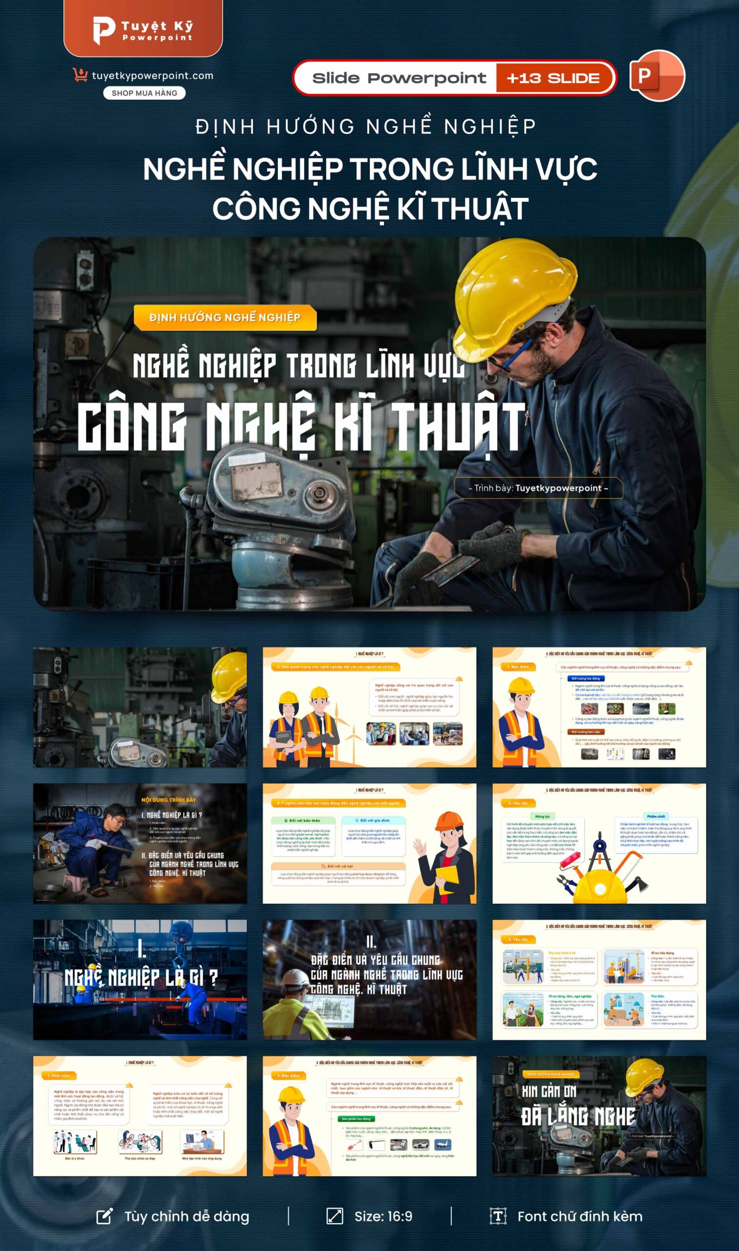 Mẫu Slide “Định hướng nghề nghiệp – nghề nghiệp trong lĩnh vực Công nghệ Kĩ thuật” mang đến một giải pháp trực quan, dễ hiểu và thuyết phục. Với thiết kế đẹp mắt, nội dung súc tích, sản phẩm hỗ trợ hiệu quả cho việc giảng dạy, tư vấn và định hướng nghề nghiệp. Đây là lựa chọn lý tưởng cho học sinh, sinh viên, giáo viên và cả các tổ chức đào tạo, doanh nghiệp.