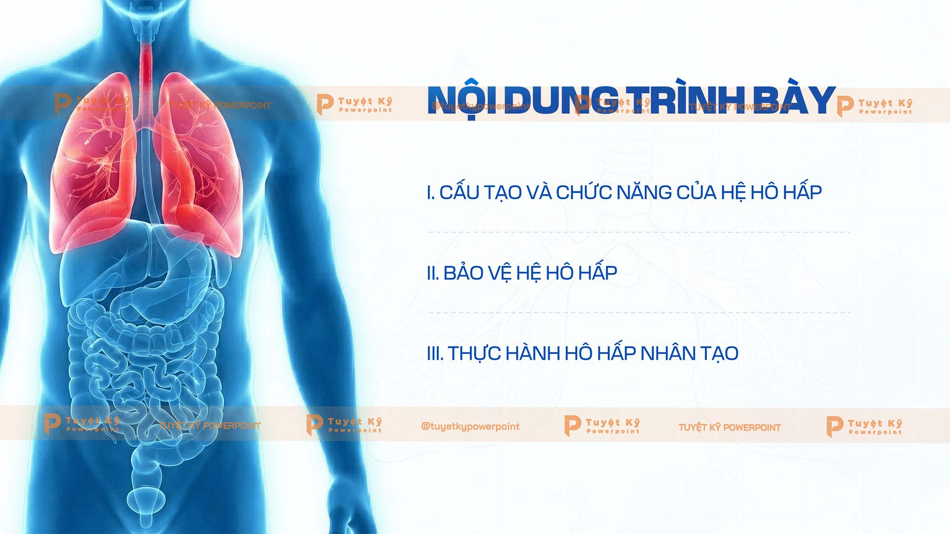 Nội dung slide tập trung làm rõ cấu tạo và chức năng của hệ hô hấp, các biện pháp bảo vệ hệ hô hấp trước các tác nhân gây hại, đồng thời hướng dẫn những thao tác cơ bản trong thực hành hô hấp nhân tạo. Slide sử dụng ngôn ngữ khoa học, chính xác, phù hợp với trình độ học sinh lớp 8 và thuận tiện cho giáo viên sử dụng trong quá trình giảng dạy.