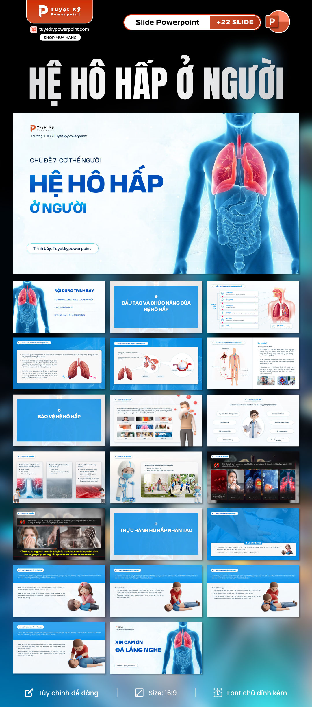 Bộ slide “Hệ Hô Hấp Ở Người – Sinh học 8” được thiết kế bám sát nội dung sách giáo khoa, phù hợp cho giảng dạy và học tập ở bậc THCS. Slide có bố cục rõ ràng, logic, chia nội dung theo từng mục lớn tương ứng với bài học trong SGK. Hình ảnh minh họa cấu tạo hệ hô hấp, phổi, phế nang và quá trình trao đổi khí được trình bày trực quan, dễ quan sát và dễ ghi nhớ.