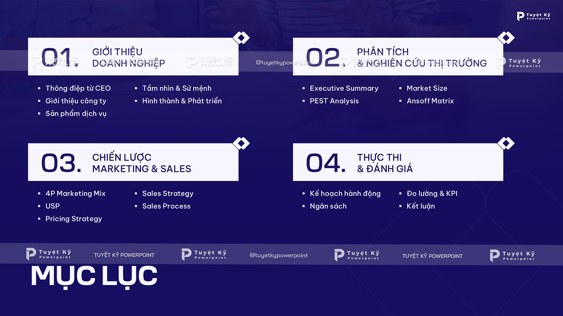 Phần nội dung bao gồm: Giới thiệu doanh nghiệp, Phân tích & nghiên cứu thị trường, Chiến lược Marketing & Sales, Thực thi & đánh giá. Mỗi nhóm được liệt kê bằng các đầu mục rõ ràng, giúp người xem hình dung tổng quan toàn bộ kế hoạch marketing.
