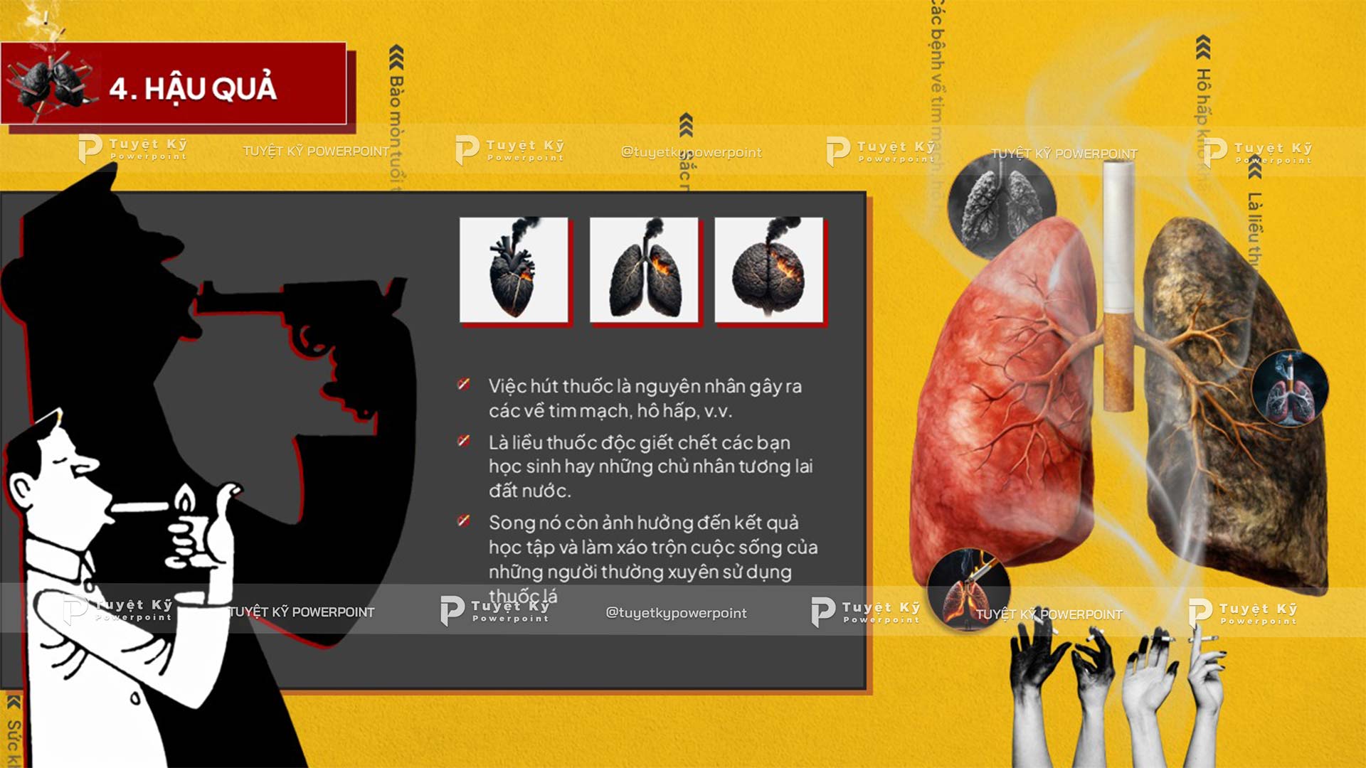 Hình ảnh minh họa phổi, khói thuốc, biểu đồ và nhân vật hoạt hình giúp tăng tính trực quan. Font chữ lớn, sắc nét, tiêu đề ấn tượng tạo điểm nhấn chuyên nghiệp. Thiết kế phù hợp cho học sinh, sinh viên, giáo viên, cán bộ y tế hoặc người làm truyền thông sức khỏe cộng đồng.