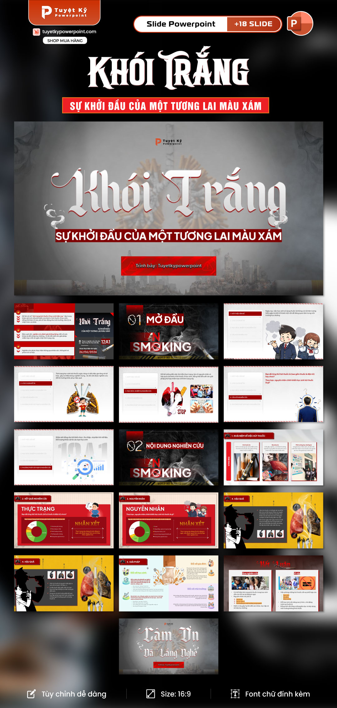 Mẫu slide “Khói Trắng – Sự khởi đầu của một tương lai màu xám” cung cấp đầy đủ cấu trúc cho bài thuyết trình tuyên truyền về tác hại thuốc lá. Nội dung đã được sắp xếp sẵn theo từng phần, hình ảnh minh họa rõ ràng, biểu đồ trực quan nên người dùng chỉ cần chỉnh sửa nhanh là có thể trình bày ngay. Nếu bạn cần một bài thuyết trình chuyên nghiệp, tiết kiệm thời gian chuẩn bị, mẫu slide tại Tuyệt Kỹ PowerPoint là lựa chọn phù hợp.