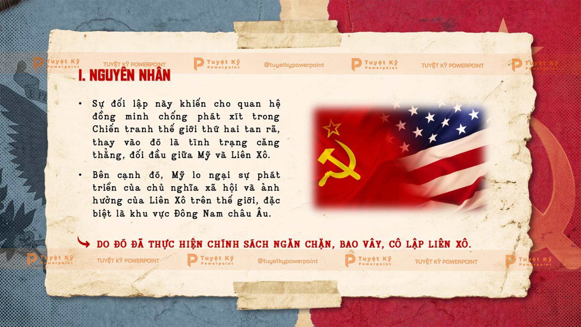 I. Nguyên nhân: Mâu thuẫn ý thức hệ tư bản – xã hội chủ nghĩa, tranh giành ảnh hưởng toàn cầu sau Thế chiến II, hình thành hai cực đối đầu.