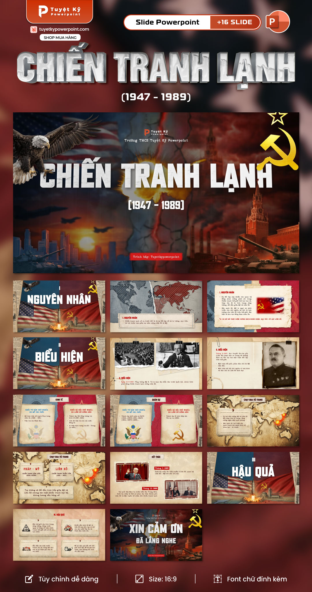 Bộ slide gồm hơn 16 trang, thiết kế theo tỷ lệ 16:9 hiện đại, sử dụng tông màu đỏ – xanh đối lập tượng trưng cho hai khối Đông – Tây. Hình ảnh minh họa gồm bản đồ thế giới, biểu tượng búa liềm, cờ Mỹ và các yếu tố chiến tranh tạo điểm nhấn mạnh mẽ.
