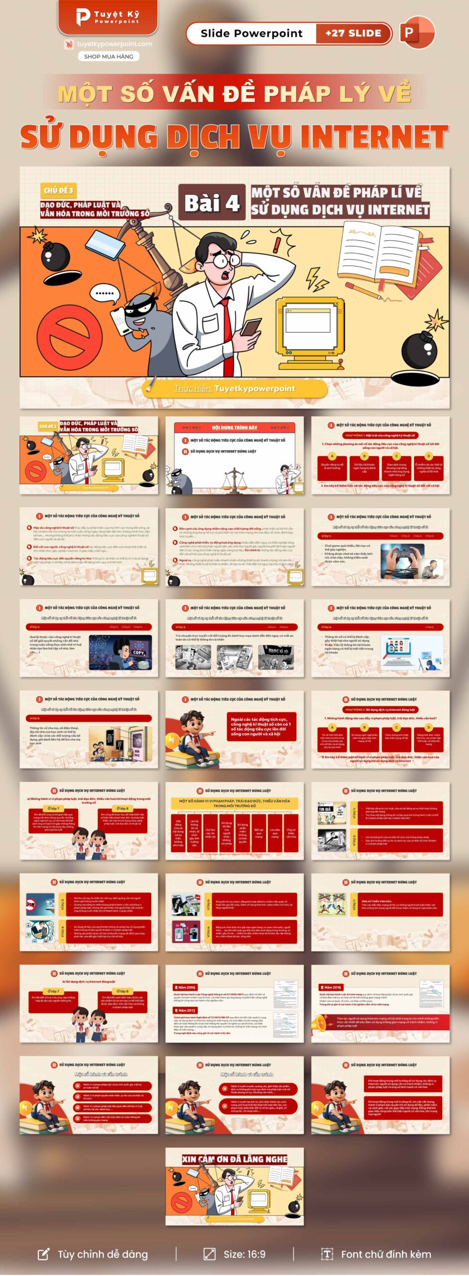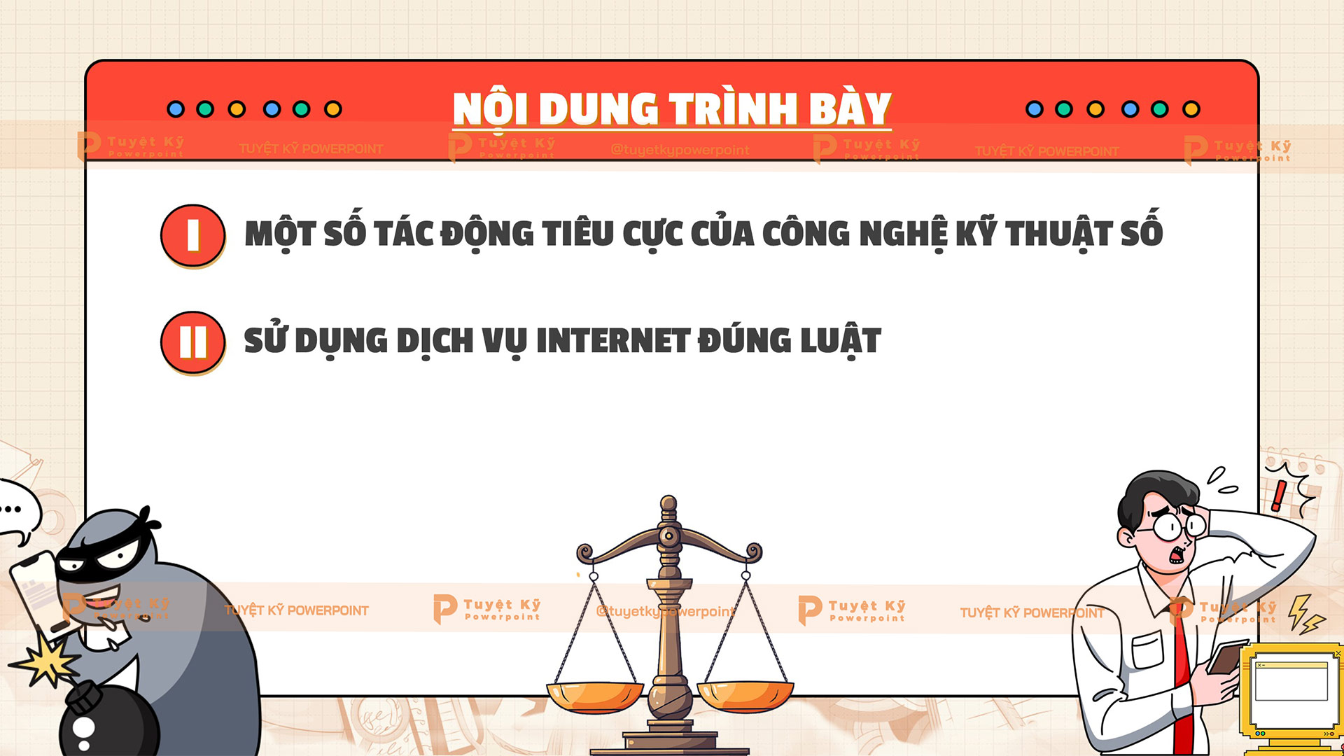 Mẫu slide được thiết kế theo phong cách học tập trực quan kết hợp biểu tượng công nghệ, cán cân pháp luật và nhân vật minh họa sinh động. Nội dung trình bày khoa học, xen kẽ hình ảnh, ví dụ và trích dẫn luật thực tế.