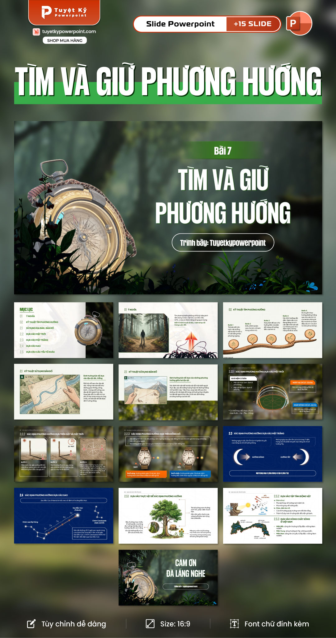Mẫu slide “Tìm và giữ phương hướng” thuộc bài 7 môn Giáo dục Quốc phòng – An ninh 12 được thiết kế nhằm hỗ trợ giảng dạy và thuyết trình hiệu quả. Nội dung tập trung vào kỹ năng xác định phương hướng trong điều kiện thực tế, đặc biệt hữu ích trong môi trường dã ngoại, huấn luyện hoặc tình huống khẩn cấp.