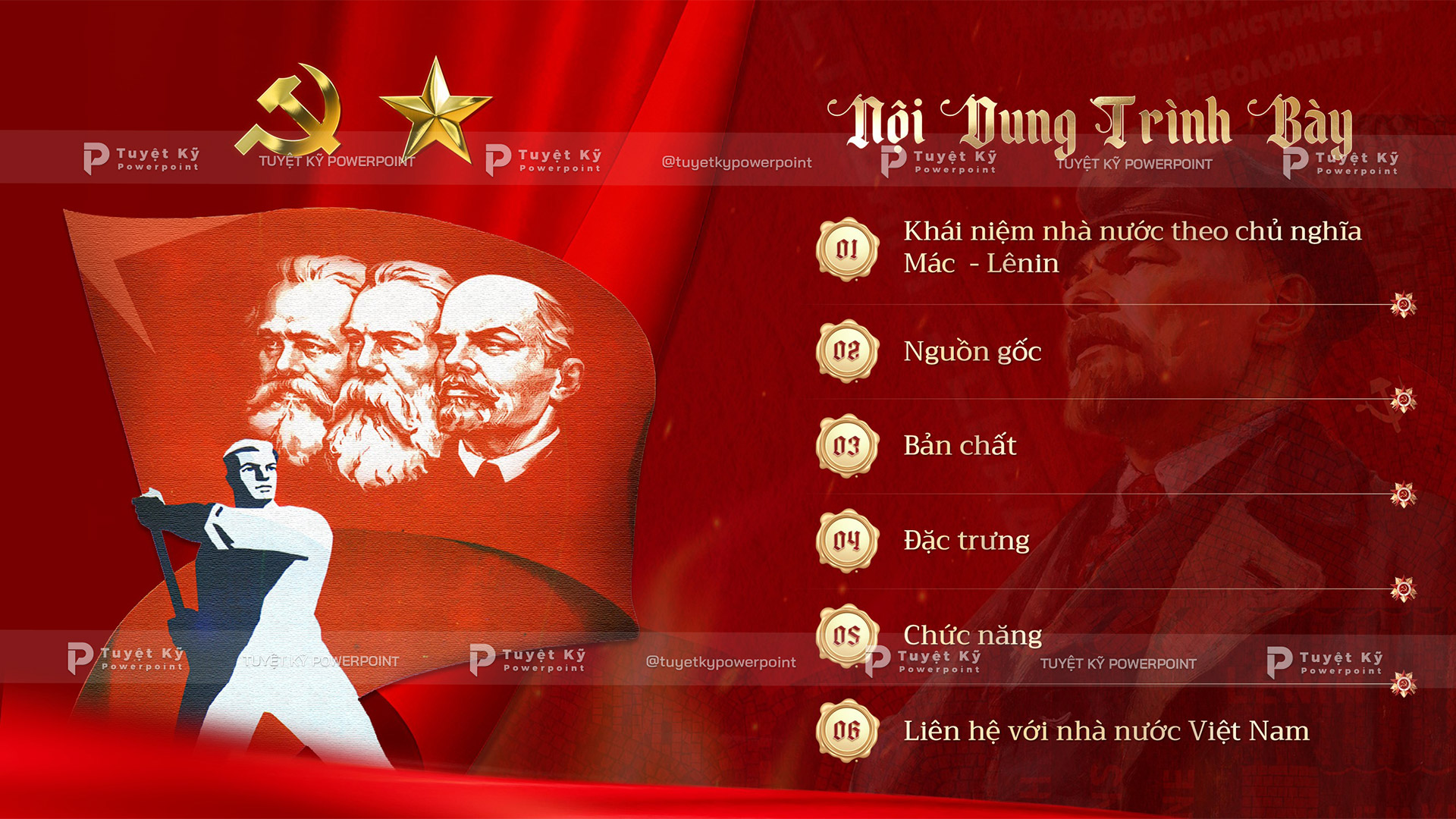 Mẫu Powerpoint Triết học Mác – Lênin: Quan điểm của chủ nghĩa Mác – Lênin về Nhà nước được trình bày tone đỏ – vàng cổ điển, gắn liền với phong cách cách mạng Mác – Lênin. Các slide có hình ảnh tư liệu của Mác, Ăngghen, Lênin, biểu tượng búa liềm và ngôi sao vàng, giúp tăng tính trang trọng và trực quan.