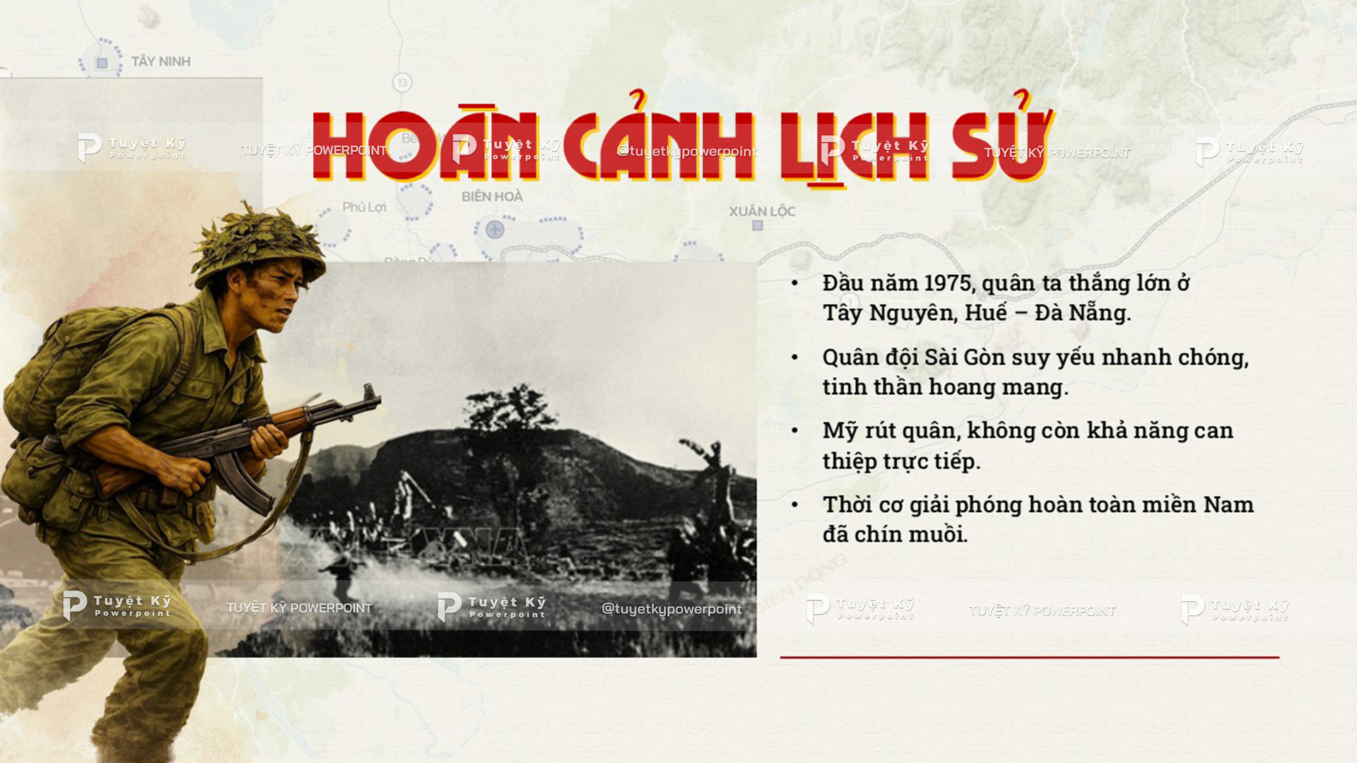 Ảnh tư liệu đen trắng, bản đồ chiến dịch, hình ảnh gắn với thời điểm lịch sử cụ thể sẽ tăng chiều sâu cho bài trình bày. Những hình ảnh đó không chỉ minh họa mà còn giúp người nghe cảm nhận được không khí của thời đại.