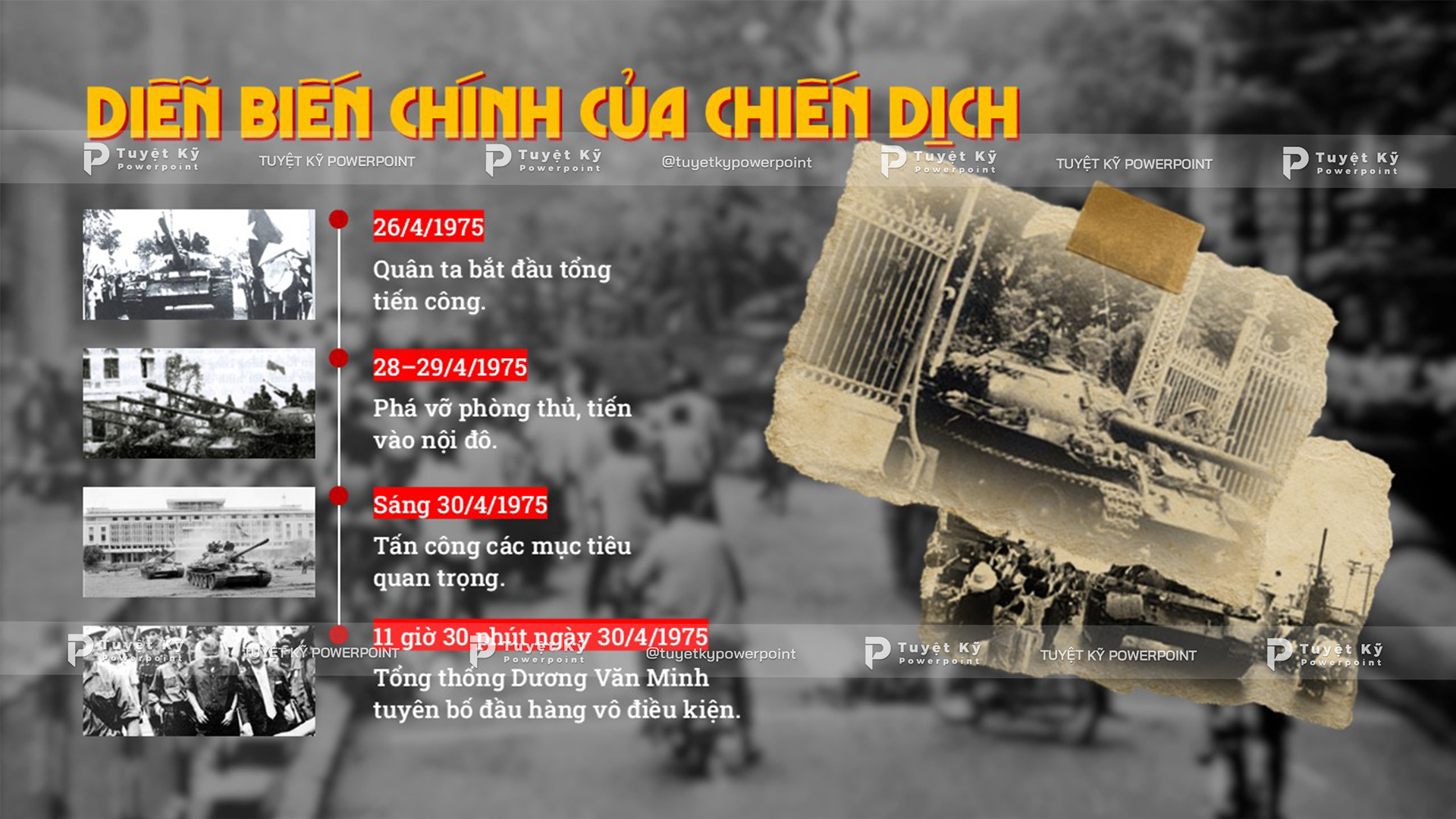 Nếu bạn đang chuẩn bị bài thuyết trình về một trong những chủ đề lịch sử này, hãy tham khảo những mẫu slide được thiết kế theo từng chủ đề mà Tuyệt Kỹ Powerpoint đã chuẩn bị. Mỗi mẫu đều được xây dựng để phù hợp với tính chất riêng của từng sự kiện, giúp bạn có điểm xuất phát tốt nhất cho bài trình bày của mình.