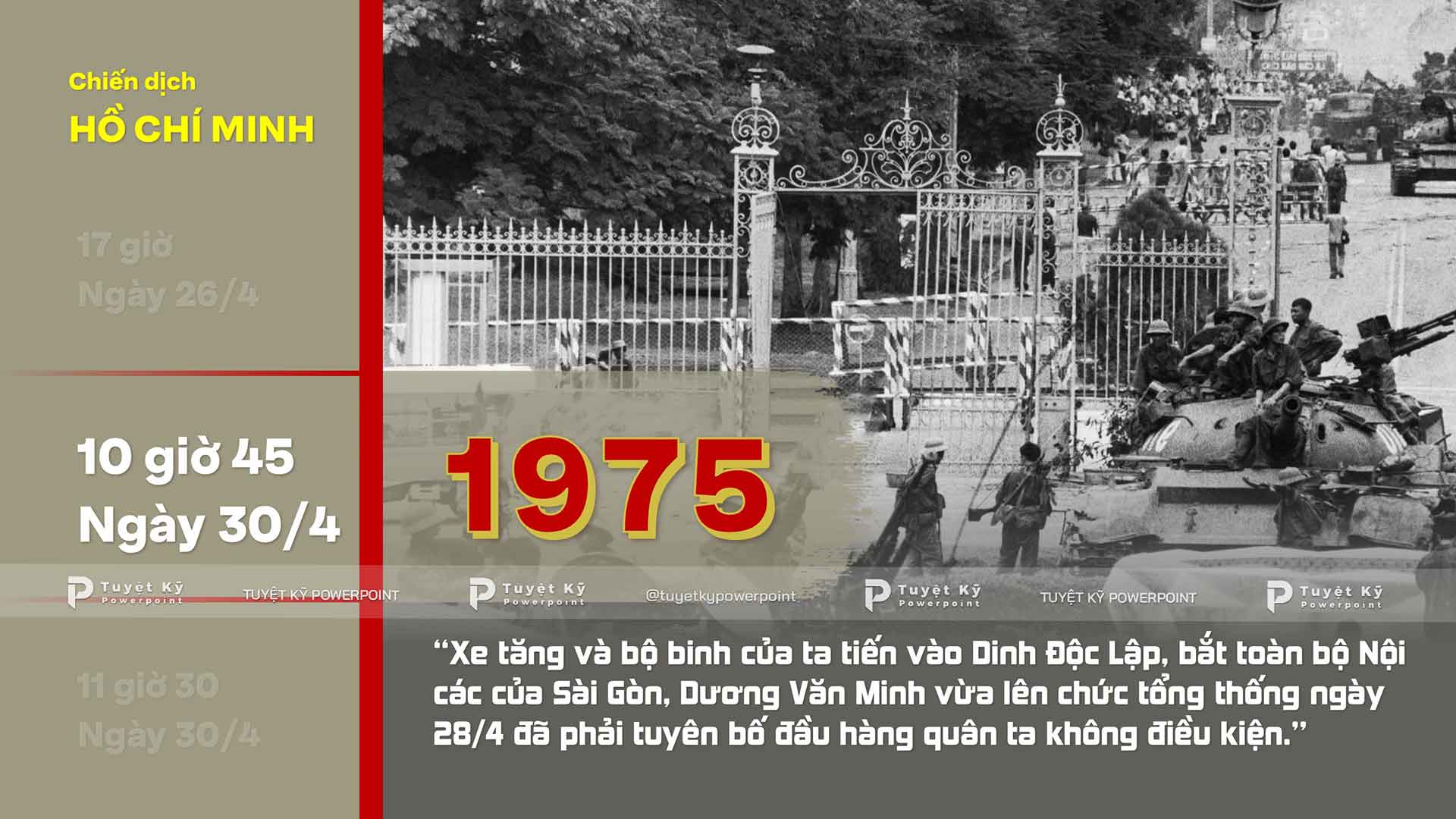 Khi thiết kế bài thuyết trình về ngày 30/4, hãy tập trung vào mạch diễn biến của chính ngày hôm đó, từng mốc thời gian cụ thể, hình ảnh mang tính biểu tượng và ý nghĩa của thời khắc thống nhất. Đây là chủ đề cân bằng giữa trang trọng lịch sử và cảm xúc cá nhân, nên thiết kế cũng cần phản ánh được sự cân bằng đó.